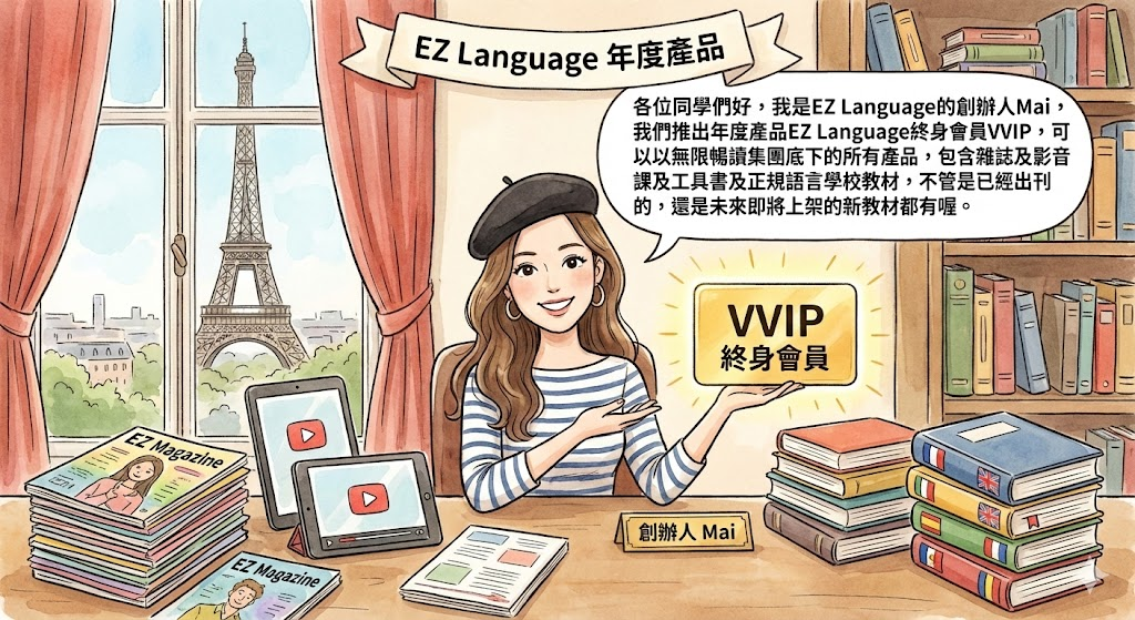 各位同學們好,我是EZ Language的創辦人Mai,我們推出年度產品EZ Language終身會員VVIP,可以無限暢讀集團底下的所有產品,包含雜誌及影音課及工具書,不管是已經出刊的,還是未來即將上架的新教材都有喔。