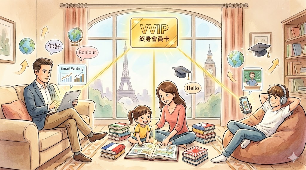 我不希望你每次想提升自己時,都要重新考慮價格。我希望VVIP無限暢讀成為你書房裡那座「永遠搬不走」的圖書館。這個 VVIP 方案,是我對每一位終身學習者的承諾——只要你願意前進,我們就負責為你準備好所有的子彈。