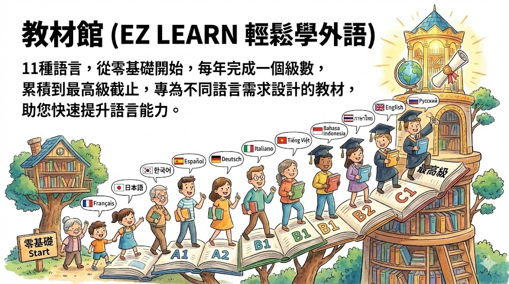 4.教材館(EZ LEARN輕鬆學外語):11種語言,從零基礎開始,每年完成一個級數,累積到最高級截止,專為不同語言需求設計的教材,