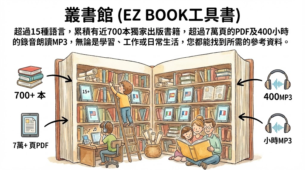 3.叢書館(EZ BOOK工具書):超過15種語言,累積有近700本獨家出版書籍,超過7萬頁的PDF及400小時的錄音朗讀MP3,無論是學習、工作或日常生活,