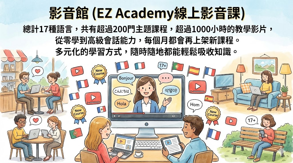 2.影音館(EZ Academy線上影音課):總計17種語言,共有超過200門主題課程,超過1000小時的教學影片,從零學到高級會話能力,每個月都會再上架新課程。多元化的學習方式,隨時隨地都能輕鬆吸收知識。