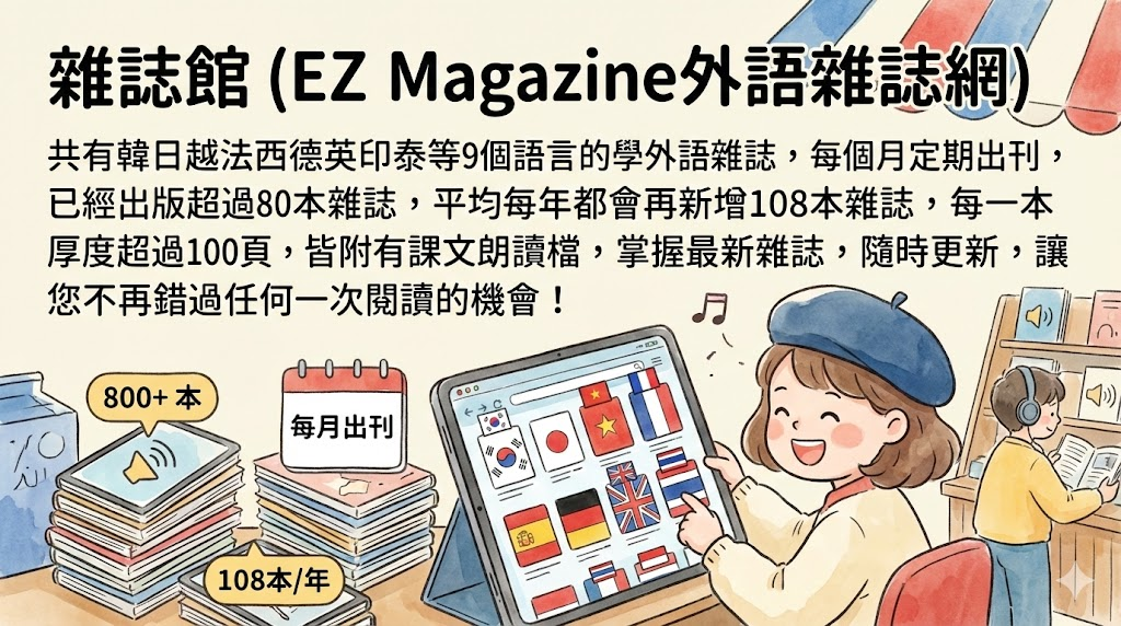 1.雜誌館(EZ Magazine外語雜誌網):共有韓日越法西德英印泰等9個語言的學外語雜誌,每個月定期出刊,已經出版超過800本雜誌,平均每年都會再新增108本雜誌,每一本厚度超過100頁,皆附有課文朗讀檔,掌握最新雜誌,隨時更新,