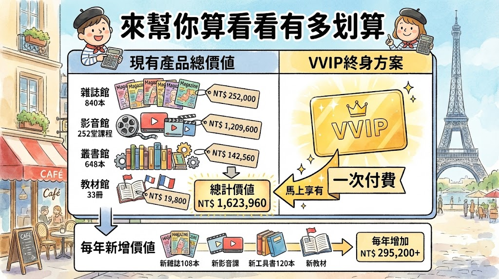 無限學習:VVIP 終身通行證(The Lifetime Pass),可使用雜誌館(876本)+影音館(272門)+叢書館(684本)+教材館(11種語言33冊)等四大館藏,每月持續更新!「一次投資,終身解決所有學習需求。」