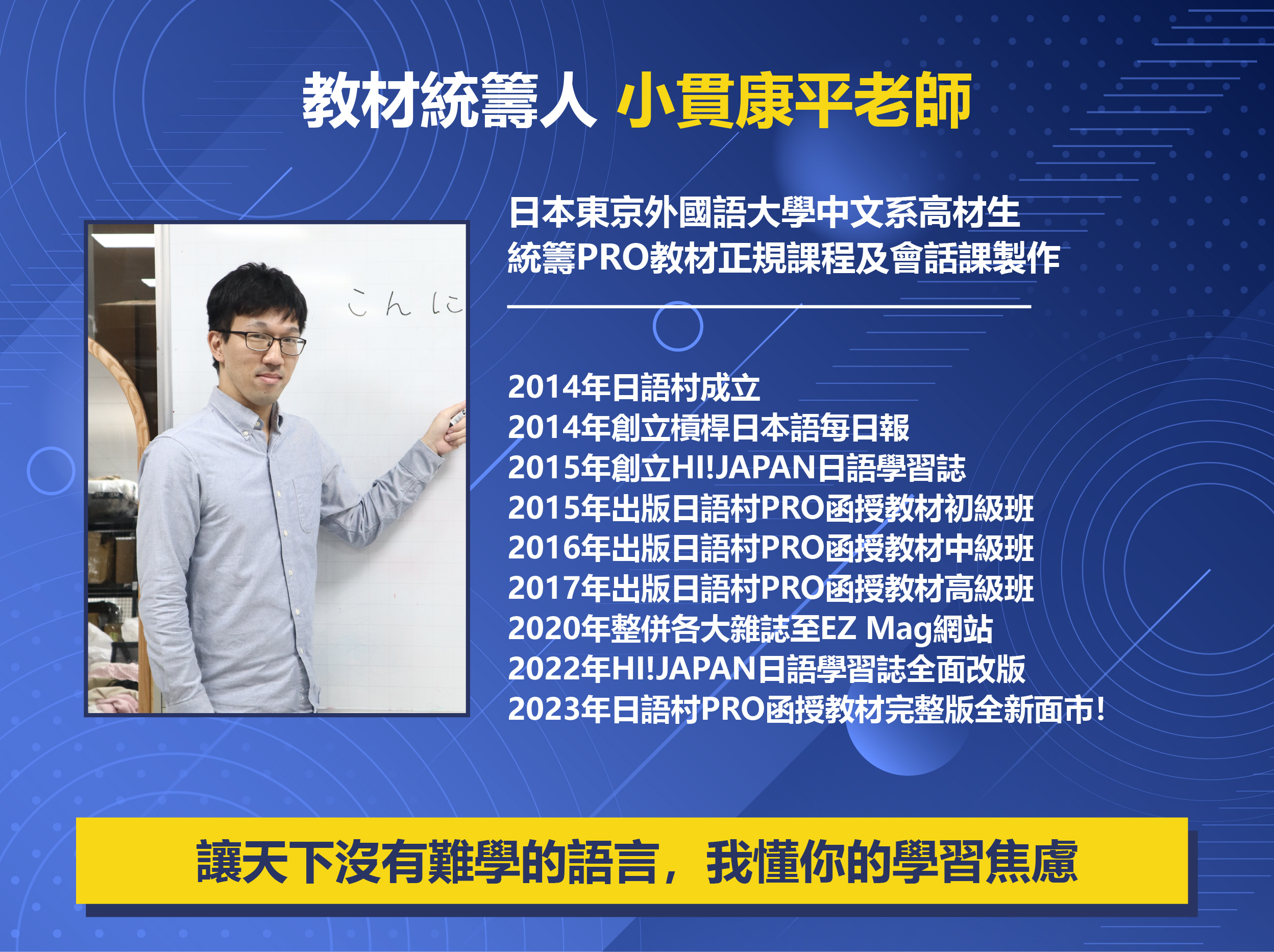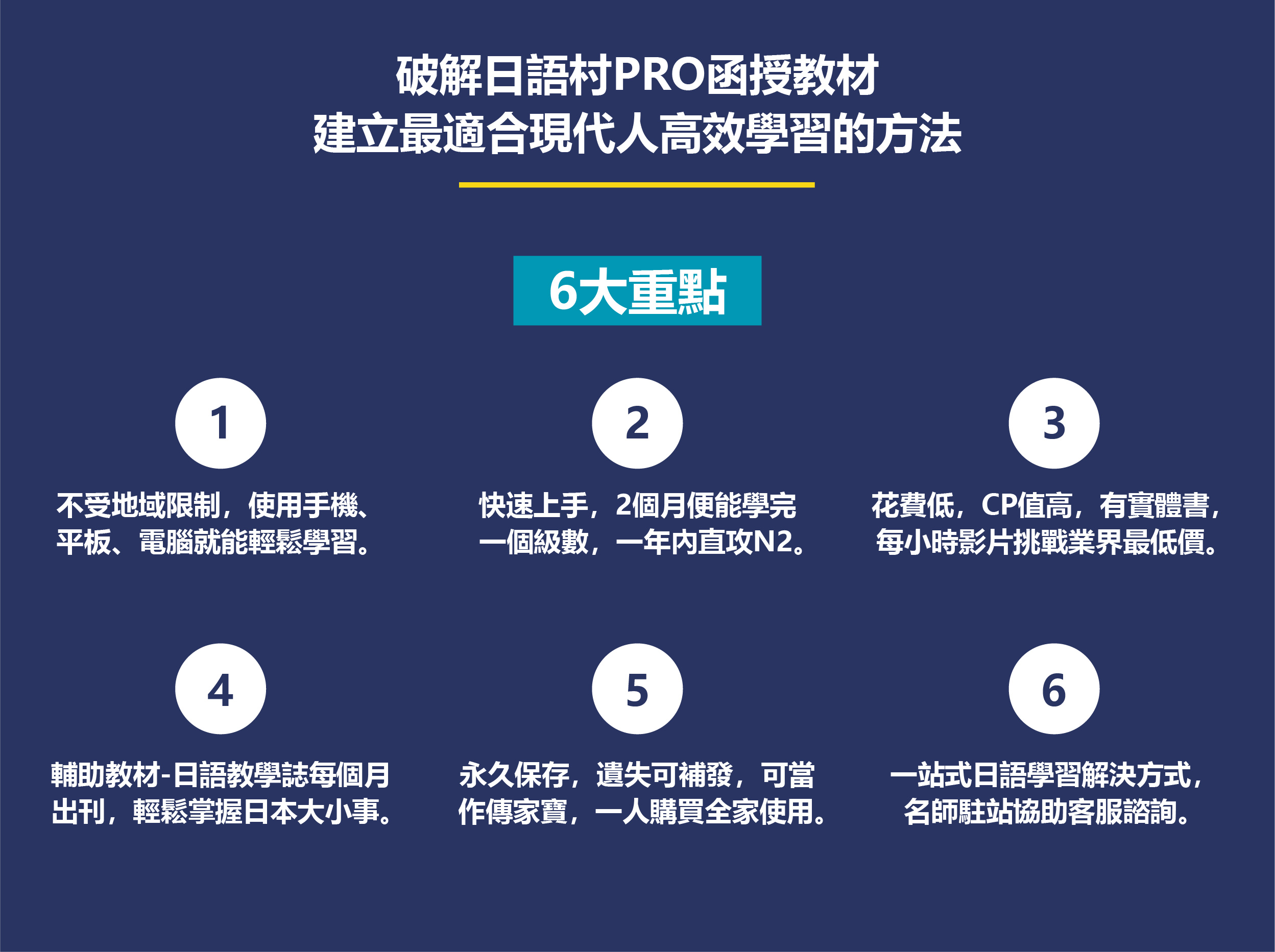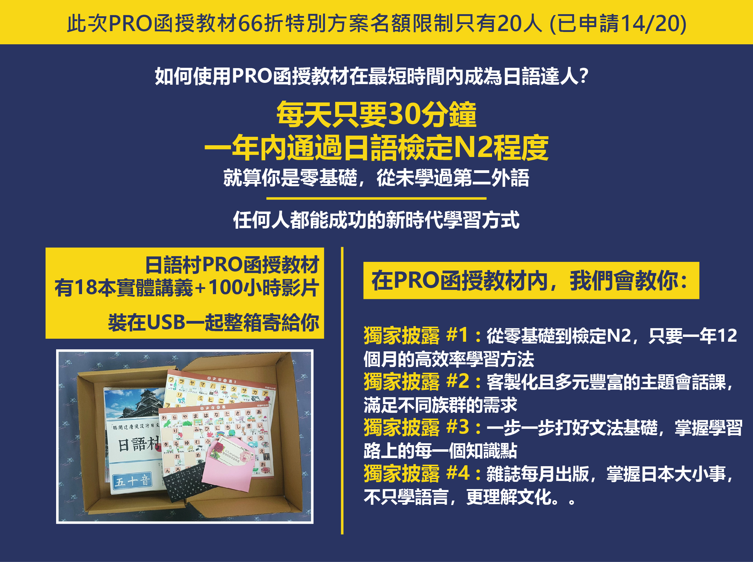 二十年的研發經驗,只為了幫你省下二十年的冤枉路。 這套「日語村PRO」函授教材,將會是你日語學習歷程中最後一套購買的系統化教材。