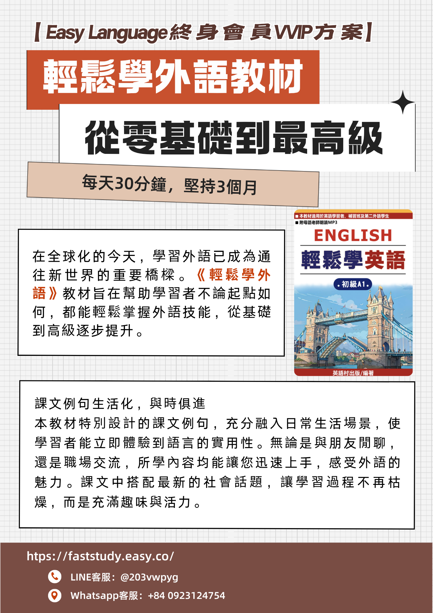 立即加入 EZ Language 終身會員 VVIP 方案,開啟您的無限學習之旅! 了解更多並立即訂閱,讓學習更簡單!