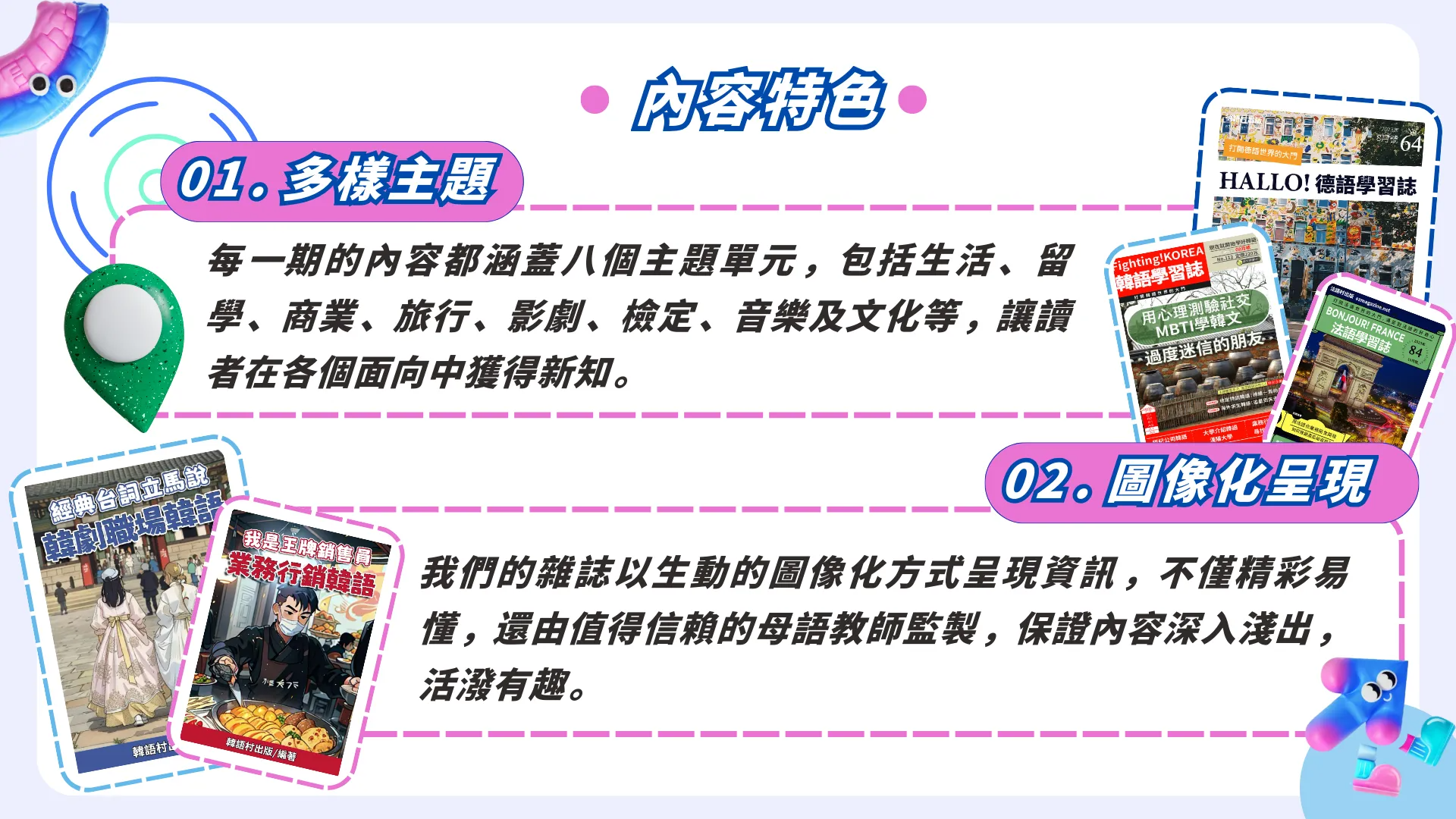 我們希望你是可以透過雜誌,融入當地的文化背景、掌握流行話題、我們也會設計該語言的情境會話,讓你身歷其境,針對進階一點的讀者,還有精選文章閱讀,讓你可以在短期內,全方位提升聽說讀寫實力。